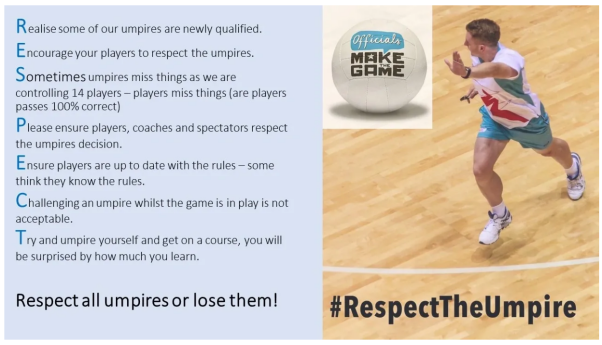 Respect the Umpire Think about this next time you hear someone moan about umpires. A standard game of netball is 60 minutes. The ball has to be passed at least every three seconds. This results in the ball being passed (at an absolute minimum) 1,200 times a match. Every time a player catches the ball, an umpire has to check seven things involving the player with the ball and their opponent (footwork, contact, how they got the ball, obstruction, offside etc.). Almost simultaneously, the umpire has to look down the court and check other players are in their correct areas and are not blocking each other in their attempts to move. This could involve scanning 10 different players, while keeping one eye on the player with the ball and their opponent.